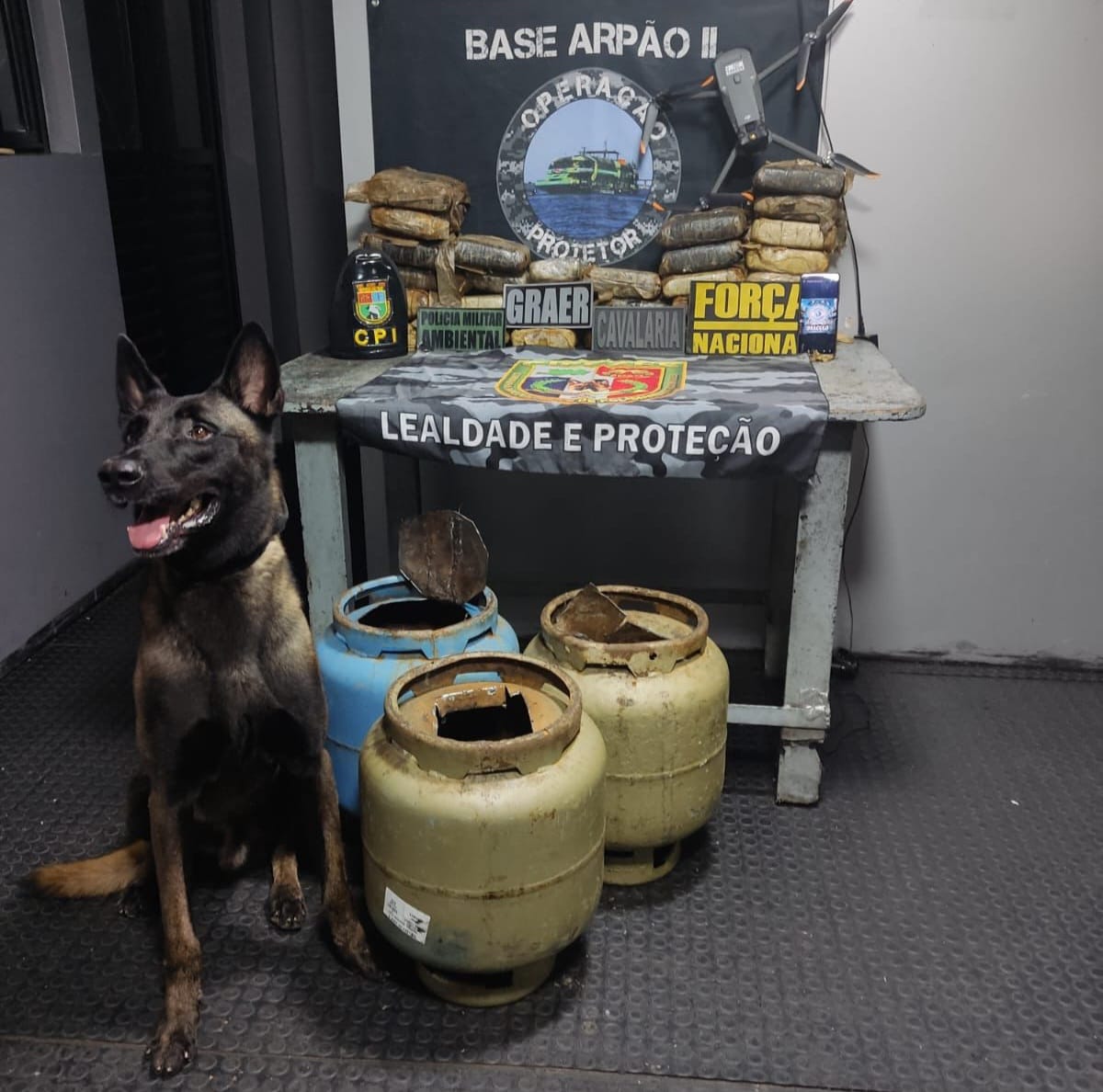 Nas buscas no convés, o cão policial Xerife farejou entorpecentes dentro de três botijas de gás. Ao inspecionar os recipientes, os policiais militares encontraram 30 tabletes de drogas.