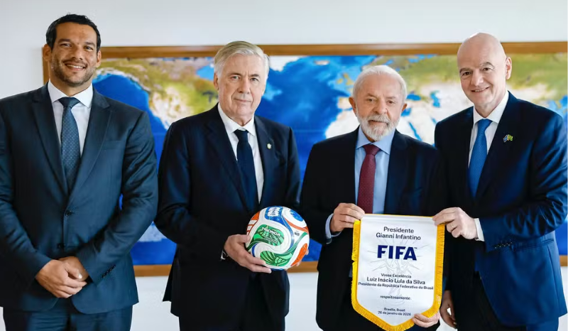 Lula recebeu o presidente da Fifa, Gianni Infantino, além do presidente da CBF, Samir Xaud, e o técnico da Seleção Brasileira, Carlo Ancelotti (Foto: Ricardo Stuckert/Presidência da República)