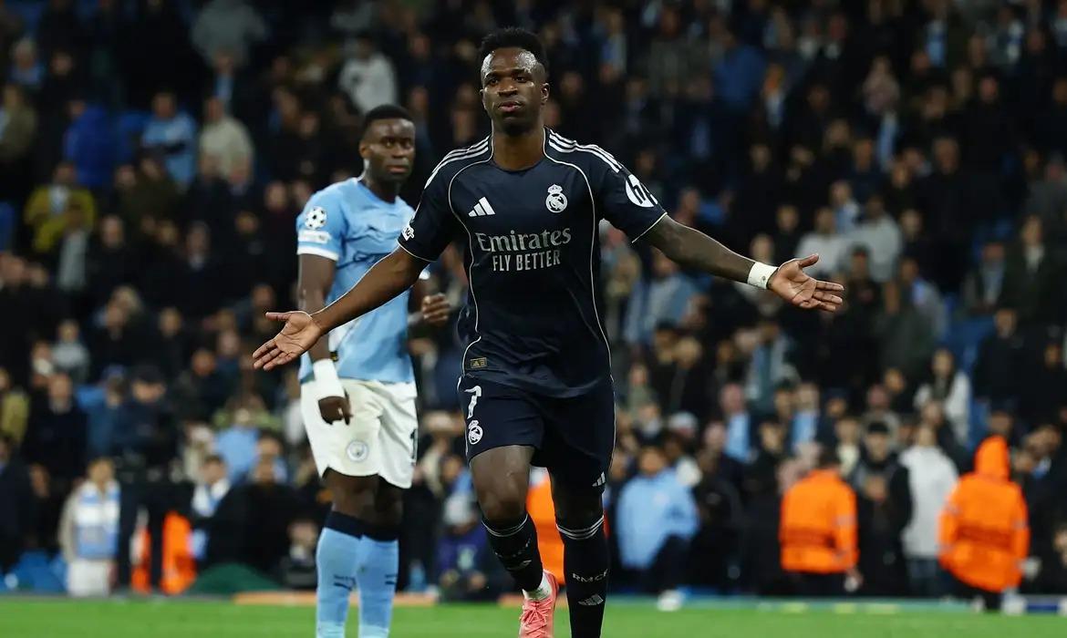 Com dois gols do brasileiro Vinicius Júnior, o Real Madrid (Espanha) derrotou o Manchester City (Inglaterra) pelo placar de 2 a 1, na noite desta terça-feira (17) no estádio City of Manchester, e garantiu a classificação para as quartas de final da Liga dos Campeões da Europa.