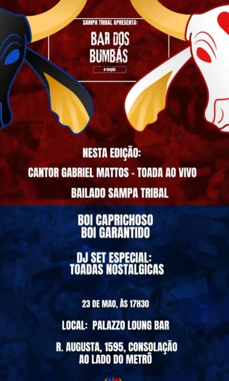 Manaus – A cultura do boi-bumbá vai atravessar o país e desembarcar na cidade de São Paulo com uma programação inédita promovida pelo grupo de dança Sampa Tribal. A 9ª edição do Bar dos Bumbas leva para o público paulista uma imersão no universo dos bois Festival Folclórico de Parintins, com foco nas tradições dos bumbás Caprichoso e Garantido, no dia 23 de maio, das 17h30 às 23h, no Palazzo Loung Bar, Ao lado do metrô Consolação (Linha Verde).