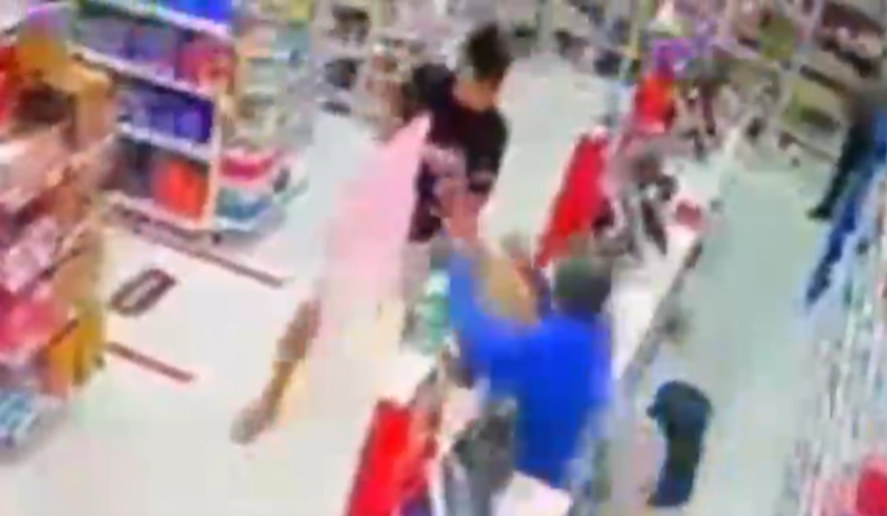 As imagens mostram o suspeito entrando no estoque do estabelecimento e saindo com caixas de medicamentos nas mãos. Na sequência, o policial Maykon Dhonatas Martins de Souza, que estava à paisana, reage à ação e efetua disparos contra o homem, que cai no local.
